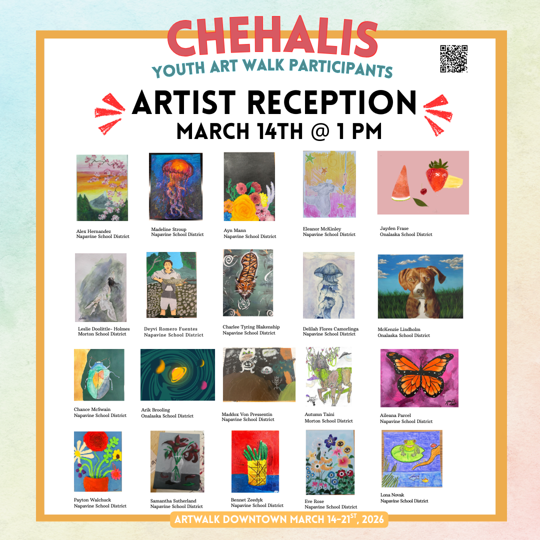 Thanks to the support from the James Augustus Smith Charitable Performing Arts Trust, Experience Chehalis, and downtown Chehalis Businesses we were able to develop the Youth Art Walk program for High School students in Lewis County. After forty submissions, twenty artists were chosen to represent this inaugural program, with the help of our jurors, David Hart (Book n’ Brush), Sara Askins (Minty City Coffeehouse), Jan Nontell (Rectangle Gallery), Liza Brenner (SPS College Art Professor), and Annalee Tobey (Experience Chehalis).