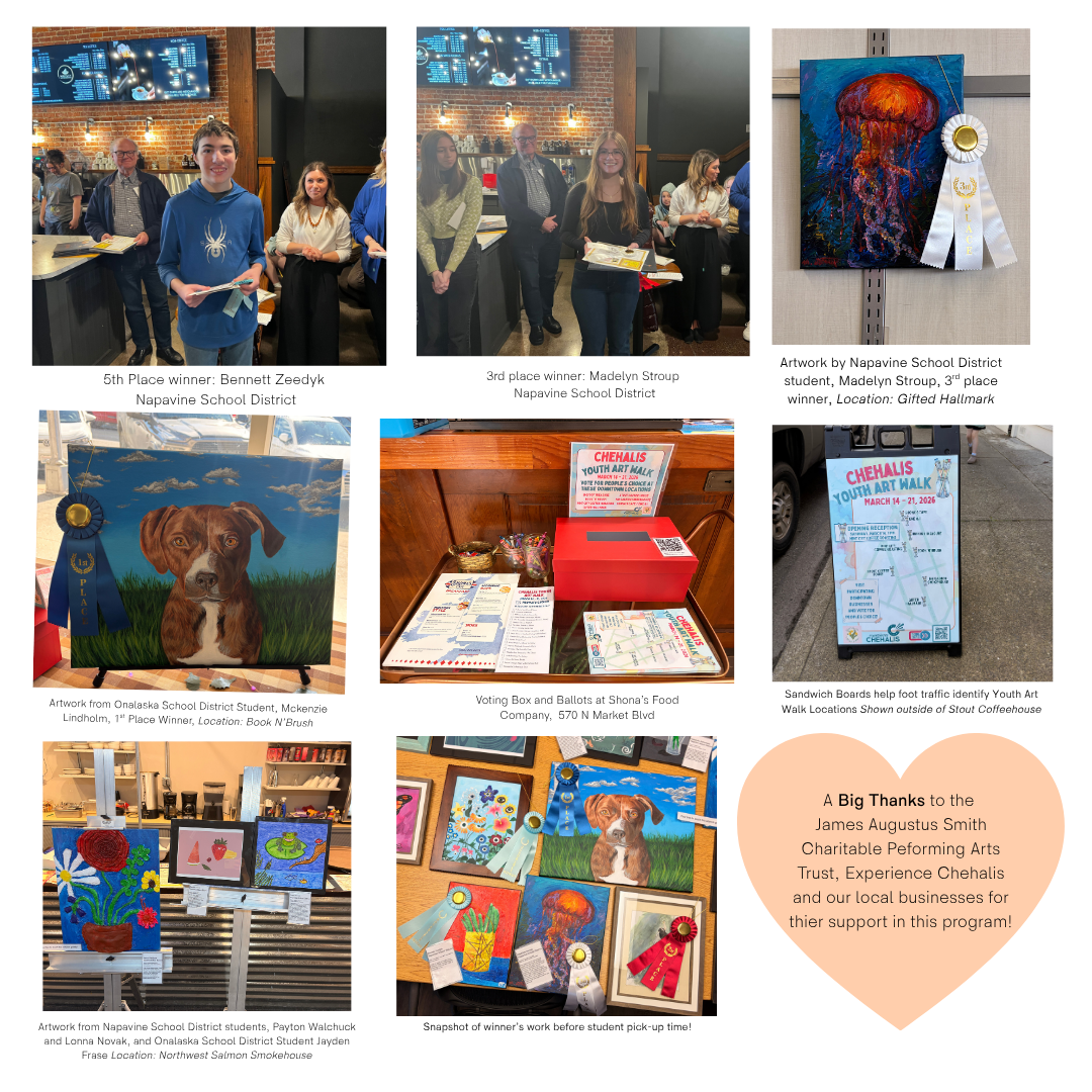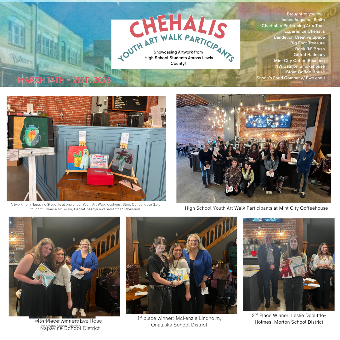 The twenty artist had the opportunity to display their artwork downtown Chehalis at our participating businesses for one week in March starting with an artist reception at Mint City Coffeehouse. During this reception, artists were acknowledged as well as the 1st through 5th place winners announced. Artists who placed received cash prizes from the James Augustus Smith Charitable Performing Arts Trust. During the week of Youth Artwalk community members had the opportunity to vote on their favorites with ballot boxes at participating locations. The artist with the most votes at the end of the week received a $100 prize from Experience Chehalis, a $25 gift certificate and special book from Book n’ Brush and a swag bag from Big Foot Treasure!